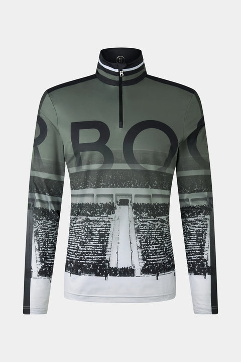 In a motif print design with logo lettering, the Verti first layer is a modern piece for functional outfits. The stand-up collar with short zip completes the style. The stretchy fabric made from technical fibres ensures comfort.