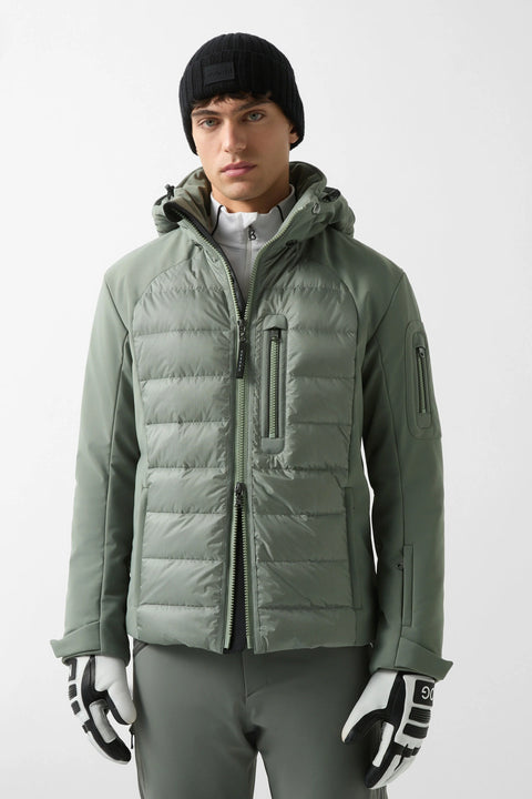 La giacca da sci softshell Zoran presenta un design misto con sezioni elastiche in 4 direzioni e parte anteriore trapuntata in ripstop con imbottitura in piuma d'oca e piumino. Il cappuccio con coulisse, la zip a due vie con fodera e gli inserti in mesh sotto le maniche garantiscono comfort. Dettagli sottili con logo accentuano questo capo moderno per sport invernali.