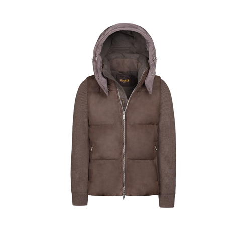 Dynamic down jacket padded with ultrafine goose down and quilted in large boudin. A distinctive feature of MooRER is the versatility of its garments, which in this case is expressed by the possibility of removing the sleeves and hood, transforming the down jacket into a modern vest. Made from three materials: a lightweight suede for the body, an iridescent microfiber with a silky appearance and soft peach-touch finish for the hood, and a warm knit for the practical sleeves.