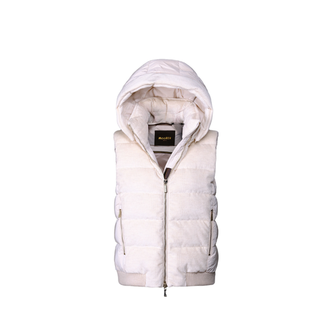 Bomber-style vest that blends functionality with style. Padded with soft down for warmth and lightness, the garment is crafted from a mix of materials that combine the practicality of a sporty look with a touch of casual elegance.