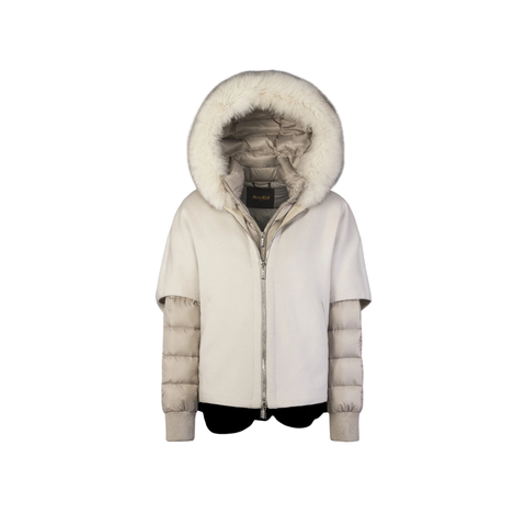 Short cape paired with a warm detachable down jacket, offering three different uses.