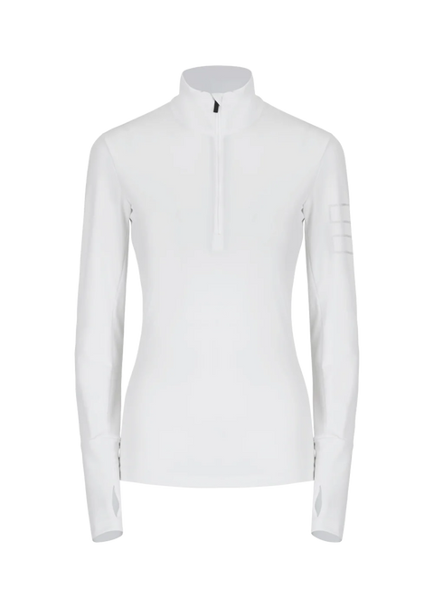 SEI TRE UNO è un dolcevita con mezza cerniera e tirante personalizzato, perfetto come primo strato durante le attività sportive. Realizzato in microfleece elasticizzato con filato rigenerato ECONYL®, questo maglione leggero e aderente presenta il logo OneMore nelle due strisce sulla manica sinistra. Sono delineate dall'applicazione in rilievo di cristalli Swarovski che aggiungono un tocco extra di brillantezza glamour.
