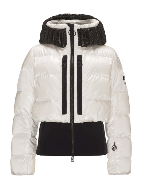 Leggera, calda e alla moda. Con l'isolamento in piuma certificata al 100%, la giacca BERNADETTE crea un look puffo molto alla moda sulle piste e nei resort. L'ottica a vestibilità ampia incontra la vestibilità slim! La cerniera frontale YKK® 2 vie METALUXE®, i loghi lucidi incollati e il tessuto speciale lucido a camere per il cappuccio rendono la BERNADETTE così progressiva.